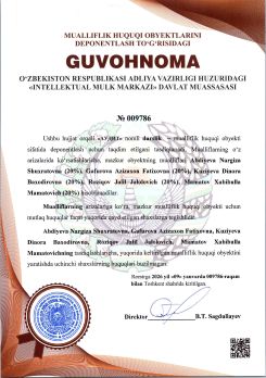 | 322 | №009797 | Ilmiy maqola – "HYGIENIC ANALYSIS OF THE CONSUMPTION OF ESSENTIAL NUTRIENTS IN THE AUTUMN SEASON AMONG MILITARY PERSONNEL WITH HYPERTENSION" | Ermatov Nizom Jumakulovich (50%), Turakulov Erkin Xasanovich (50%) | Ermatov Nizom Jumakulovich, Turakulov Erkin Xasanovich | 01/16/2026 | ![]() |