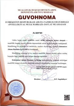 | 338 | №009781 | Dizayn asari – "OZBEK BY KASIMOV" | Kasimov Komil Abdunosirovich (50%), Qosimov Abdulqodir Komil o‘g‘li (50%) | Kasimov Komil Abdunosirovich (50%), Qosimov Abdulqodir Komil o‘g‘li (50%) | 01/06/2026 | ![]() |