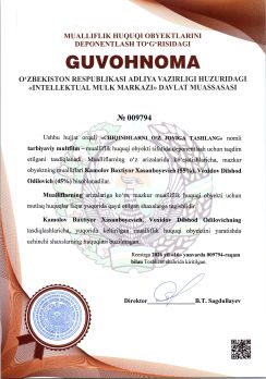 | 339 | №009780 | Dizayn asari – "ДИЗАЙН ГЛАЗУРОВАННОЙ КЕРАМИЧЕСКОЙ ПЛИТКИ "РОХАТ"" | Ayupov Abdulxamid Akbarovich (100%) | Ayupov Abdulxamid Akbarovich | 01/06/2026 | ![]() |