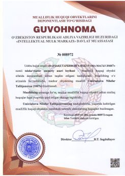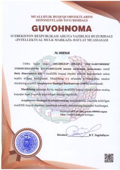 348 | №008975 | Ilmiy ishlanma – "Совершенствование классификации и методов ведения мониторинга земель сельских населенных пунктов с применением ДЗЗ" | Romanyuk Yuliya Anatolevna (50%), Abdullayev Tulqin Mansurovich (25%), Raxmonov Kosimdjon (25%) | Romanyuk Yuliya Anatolevna, Abdullayev Tulqin Mansurovich, Raxmonov Kosimdjon | 10.06.2025 | ![]() |