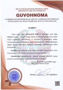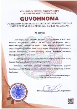 352 | №008971 | ilmiy ishlanma (loyiha) – "KO‘MAKCHI ISHG‘OL NARVONI" | Mirbabayev Damir Mirjamalovich (34%), Shermatov Alisher Anarbayevich (33%) Ruzmetov Jamoliddin Axmadjanovich (33%) | Mirbabayev Damir Mirjamalovich, Shermatov Alisher Anarbayevich, Ruzmetov Jamoliddin Axmadjanovich | 09.06.2025 | ![]() |