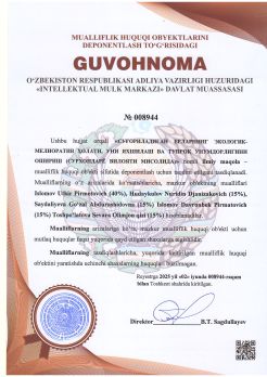 379 | №008944 | Ilmiy maqola – "СУҒОРИЛАДИГАН ЕРЛАРНИНГ ЭКОЛОГИК-МЕЛИОРАТИВ ҲОЛАТИ, УНИ ЯХШИЛАШ ВА ТУПРОҚ УНУМДОРЛИГИНИ ОШИРИШ (СУРХОНДАРЁ ВИЛОЯТИ МИСОЛИДА)" | Islomov Utkir Pirmetovich (40%), Hudaykulov Nuridin Djanizakovich (15%), Saydaliyeva Go‘zal Abdurashidovna (15%) Islomov Davronbek Pirmatovich (15%) Toshpo‘latova Sevara Olimjon qizi (15%) | Islomov Utkir Pirmetovich, Hudaykulov Nuridin Djanizakovich, Saydaliyeva Go‘zal Abdurashidovna, Islomov Davronbek Pirmatovich, Toshpo‘latova Sevara Olimjon qizi | 02.06.2025 | ![]() |