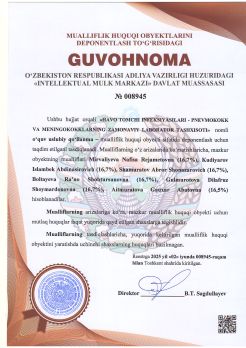378 | №008945 | O‘quv-uslubiy qo‘llanma – "HAVO TOMCHI INFEKSIYASILARI - PNEVMOKOKK VA MENINGOKOKKLARNING ZAMONAVIY LABORATOR TASHXISOTI" | Mirvaliyeva Nafisa Rejametovna (16,7%), Kudiyarov Islambek Abdinasirovich (16,7%), Shamuratov Abror Shonazarovich (16,7%), Boltayeva Ra’no Shohtursunovna (16,7%), Gulmurotova Dilafruz Shoymardonovna (16,7%), Aitmuratova Gauxar Abatovna (16,5%) | Mirvaliyeva Nafisa Rejametovna, Kudiyarov Islambek Abdinasirovich, Shamuratov Abror Shonazarovich, Boltayeva Ra’no Shohtursunovna, Gulmurotova Dilafruz Shoymardonovna, Aitmuratova Gauxar Abatovna | 02.06.2025 | ![]() |