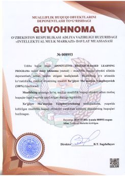 370 | №008953 | Ilmiy ishlanma (metod) – "INNOVATIVE RESEARCH-BASED LEARNING PROGRAM" | Xo‘jjiyev Ma’murjon Yangiboyevich (100%) | Xo‘jjiyev Ma’murjon Yangiboyevich | 04.06.2025 | ![]() |
