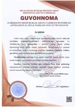 362 | №008961 | Monografiya –"FARMATSEVTIKA SANOATI KORXONALARINING RAQOBATBARDOSHLIGINI OSHIRISH YO‘LLARI" | Abdiyeva Flora Botir qizi (50%), Ismoilova Gulchiroy Tolliboy qizi (50%) | Abdiyeva Flora Botir qizi, Ismoilova Gulchiroy Tolliboy qizi | 05.06.2025 | ![]() |
