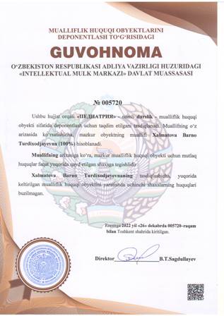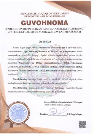 | 4377 | №005723 | Monografiya - «Роль эндогенной интоксикации в системе мать-плацента-плод при аво-иммунизации и методы ее коррекции» | Najmutdinovna Dilbar Kamariddinovna (20%), Choriyevna Gulchehra Zulfikarovna (30%), Sadikova Dilfuza Ravshanbekovna (20%), Kayumova Dilrabo Talmasovna (20%), Sadullayevna Umida Azimovna (10%) | Najmutdinovna Dilbar Kamariddinovna, Choriyevna Gulchehra Zulfikarovna, Sadikova Dilfuza Ravshanbekovna, Kayumova Dilrabo Talmasovna, Sadullayevna Umida Azimovna | 12/26/2022 | ![]() |