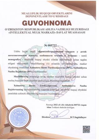 | 4378 | №005722 | Monografiya - «Бронхообструктивный синдром у детей: патогенетические аспекты, особенности течения и лечения» | Xalmatova Barno Turdixodjayevna (50%), Satibaldiyeva Nasiba Rajabovna (50%) | Xalmatova Barno Turdixodjayevna, Satibaldiyeva Nasiba Rajabovna | 12/26/2022 | ![]() |
