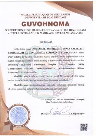 | 4375 | №005725 | O'quv uslubiy qo'llanma - «SURUNKALI OBSTRUKTIV O‘PKA KASALLIGI: TASHXISLASH VA DAVOLASHGA ZAMONAVIY YONDOSHUV» | Nurillayeva Nargiza Muxtarxanovna (34%), Zubaydullaeva Maksuda Turabdjanovna(33%), Yarmuxamedova Dilfuza Zairovna (33%) | Nurillayeva Nargiza Muxtarxanovna , Zubaydullaeva Maksuda Turabdjanovna, Yarmuxamedova Dilfuza Zairovna | 12/26/2022 | ![]() |