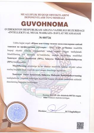| 4374 | №005726 | O'quv qo'llanma - «Юрак қон-томир тизими касалликларини қиёсий ташхиси ва профилактика усуллари» | Xamrayev Abror Asrarovich (50%), Salayeva Muborak Saidobdullayevna (50%) | Xamrayev Abror Asrarovich, Salayeva Muborak Saidobdullayevna | 12/26/2022 | ![]() |