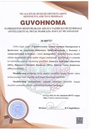 | 4373 | №005727 | Monografiya - «Сравнительная оценка влияния бисопролола и физиотенза на эндотелий зависимую тромбоцитопатию у больных с гипертонической болезнью» | Jumayeva Gulruxsor Aliyorovna (40%), Rahmatova Marhabo Rasulovna (30%), Jalalova Vazira Zamirovna (30%) | Jumayeva Gulruxsor Aliyorovna, Rahmatova Marhabo Rasulovna, Jalalova Vazira Zamirovna | 12/26/2022 | ![]() |