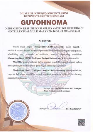 | 4372 | №005728 | Darslik - «МЕДИЦИНСКАЯ ХИМИЯ» | Masharipov Sobir (50%), Tadjiyeva Xosiyat Sultanovna (50%) | Masharipov Sobir, Tadjiyeva Xosiyat Sultanovna | 12/26/2022 | ![]() |