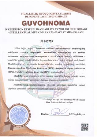 | 4371 | №005729 | O'quv uslubiy qo'llanma - “Тошкент тиббиёт академиясида шифокорлар тайёрлаш таълим жараёнига инновацион ёндошувлар ва тиббий таълимни модернизациялаштириш» | Rizamuxamedova Mashxura Zakirovna (40%), Axmedova Nigora Akbarovna (40%), Turaboyeva Sitora Zokir qizi (20%) | Rizamuxamedova Mashxura Zakirovna, Axmedova Nigora Akbarovna, Turaboyeva Sitora Zokir qizi | 12/26/2022 | ![]() |