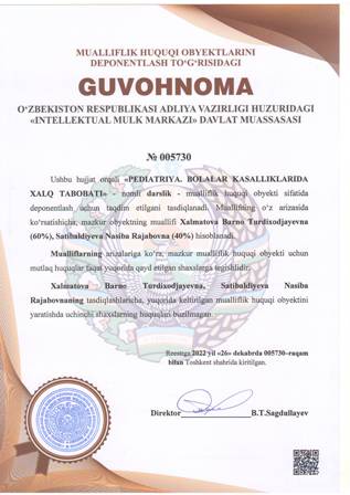 | 4370 | №005730 | Darslik - «PEDIATRIYA. BOLALAR KASALLIKLARIDA XALQ TABOBATI» | Xalmatova Barno Turdixodjayevna (60%), Satibaldiyeva Nasiba Rajabovna (40%) | Xalmatova Barno Turdixodjayevna, Satibaldiyeva Nasiba Rajabovna | 12/26/2022 | ![]() |