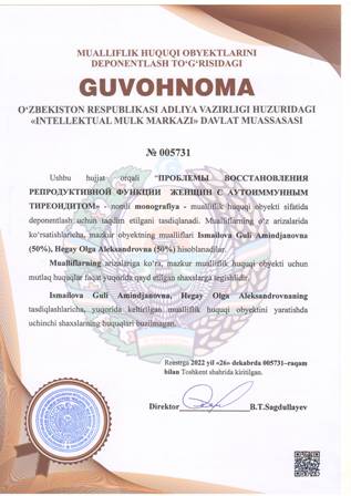 | 4369 | №005731 | Monografiya - «ПРОБЛЕМЫ ВОССТАНОВЛЕНИЯ РЕПРОДУКТИВНОЙ ФУНКЦИИ ЖЕНЩИН С АУТОИММУННЫМ ТИРЕОИДИТОМ» | Ismailova Guli Amindjanovna (50%), Hegay Olga Aleksandrovna (50%) | Ismailova Guli Amindjanovna, Hegay Olga Aleksandrovna | 12/26/2022 | ![]() |