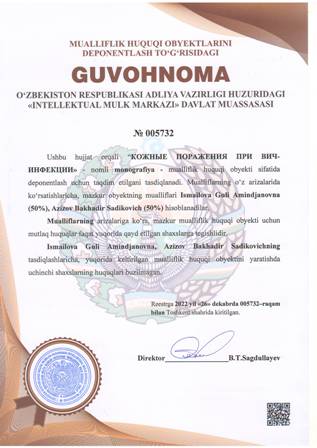 | 4368 | №005732 | Monografiya - «КОЖНЫЕ ПОРАЖЕНИЯ ПРИ ВИЧ-ИНФЕКЦИИ» | Ismailova Guli Amindjanovna (50%), Azizov Bakhadir Sadikovich (50%) | Ismailova Guli Amindjanovna, Azizov Bakhadir Sadikovich | 12/26/2022 | ![]() |