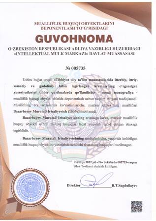 | 4365 | №005735 | Monografiya - «Tibbiyot oliy tа’lim muаssаsаlаridа itterbiy, ittriy, samariy va gadoliniy bilan legirlangan kremniyning o‘rganilgan xususiyatlarini tibbiy qurilmalarda qo‘llanilishi» | Bazarbayev Muratali Irisaliyevich (100%) | Bazarbayev Muratali Irisaliyevich | 12/26/2022 | ![]() |