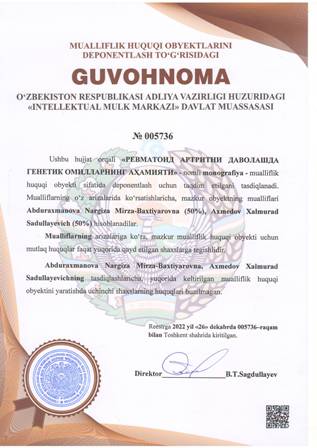 | 4364 | №005736 | Monografiya - «РЕВМАТОИД АРТРИТНИ ДАВОЛАШДА ГЕНЕТИК ОМИЛЛАРНИНГ АҲАМИЯТИ» | Abduraxmanova Nargiza Mirza-Baxtiyarovna (50%), Axmedov Xalmurad Sadullayevich (50%) | Abduraxmanova Nargiza Mirza-Baxtiyarovna, Axmedov Xalmurad Sadullayevich | 12/26/2022 | ![]() |