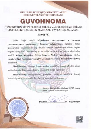 | 4363 | №005737 | Monografiya - «Проблемы диагностики и лечения урогенитального кандидоза у больных туберкулезом легких» | Vaisov Adxamjon (25%), Saipova Nodira Sagdullayevna (25%), Ismailova Guli Amindjanovna (25%), Mirodilova Firuza Baxtiyarovna (25%) | Vaisov Adxamjon, Saipova Nodira Sagdullayevna, Ismailova Guli Amindjanovna, Mirodilova Firuza Baxtiyarovna | 12/26/2022 | ![]() |