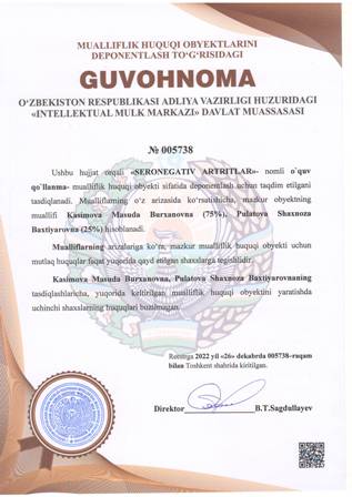 | 4362 | №005738 | O'quv qo'llanma - «SERONEGАTIV АRTRITLАR» | Kasimova Masuda Burxanovna (75%), Pulatova Shaxnoza Baxtiyarovna (25%) | Kasimova Masuda Burxanovna, Pulatova Shaxnoza Baxtiyarovna | 12/26/2022 | ![]() |
