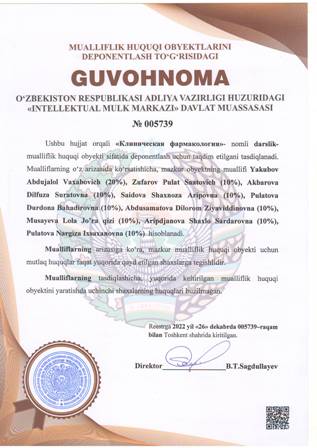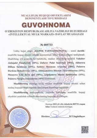 | 4367 | №005733 | Darslik - «KLINIK FARMAKOLOGIYA» | Yakubov Abdujalol Vaxabovich (20%), Zufarov Pulat Saatovich (10%), Akbarova Dilfuza Suratovna (10%), Saidova Shaxnoza Aripovna (10%), Pulatova Durdona Bahadirovna (10%), Abdusamatova Dilorom Ziyaviddinovna (10%), Musayeva Lola Jo’ra qizi (10%), Aripdjanova Shaxlo Sardarovna (10%), Pulatova Nargiza Ixsaxanovna (10%) | Yakubov Abdujalol Vaxabovich, Zufarov Pulat Saatovich, Akbarova Dilfuza Suratovna, Saidova Shaxnoza Aripovna, Pulatova Durdona Bahadirovna, Abdusamatova Dilorom Ziyaviddinovna, Musayeva Lola Jo’ra qizi, Aripdjanov | 12/23/2022 | ![]() |