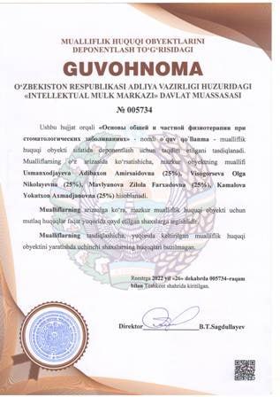 | 4366 | №005734 | O'quv qo'llanma - «Основы общей и частной физиотерапии при стоматологических заболиваниях» | Usmanxodjayeva Adibaxon Amirsaidovna (25%), Visogorseva Olga Nikolayevna (25%), Mavlyanova Zilola Farxadovna (25%), Kamalova Yokutxon Axmadjanovna (25%) | Usmanxodjayeva Adibaxon Amirsaidovna, Visogorseva Olga Nikolayevna, Mavlyanova Zilola Farxadovna, Kamalova Yokutxon Axmadjanovna | 12/23/2022 | ![]() |