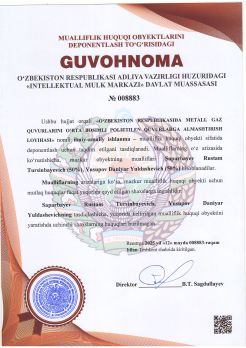 440 | №008883 | Ilmiy-amaliy ishlanma – "O‘ZBEKISTON RESPUBLIKASIDA METALL GAZ QUVURLARINI O‘RTA BOSIMLI POLIETILEN QUVURLARGA ALMASHTIRISH LOYIHASI" | Saparbayev Rustam Tursinbayevich (50%), Yusupov Daniyar Yuldashevich (50%) | Saparbayev Rustam Tursinbayevich, Yusupov Daniyar Yuldashevich | 05/12/2025 | ![]() |
