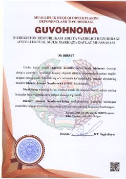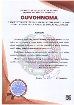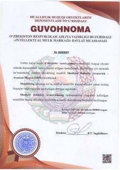 427 | №008896 | Ilmiy ishlanma (musiqa cholg‘u asbobi) – "NIM PARDALI DUTOR" | Islamov Azamat Xaydarovich (100%) | Islamov Azamat Xaydarovich | 15.05.2025 | ![]() |