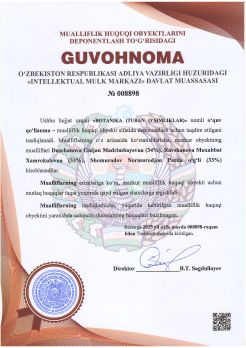 425 | №008898 | O‘quv qo‘llanma – "BOTANIKA (TUBAN O‘SIMLIKLAR)" | Duschanova Guljan Madrimbayevna (34%), Ravshanova Muxabbat Xamrokulovna (33%), Shomurodov Normurodjon Parda o‘g‘li (33%) | Duschanova Guljan Madrimbayevna, Ravshanova Muxabbat Xamrokulovna, Shomurodov Normurodjon Parda o‘g‘li | 15.05.2025 | ![]() |