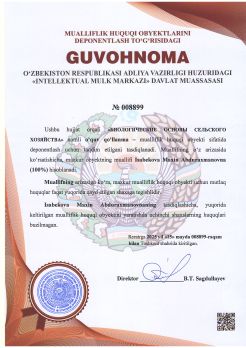 424 | №008899 | O‘quv qo‘llanma – "БИОЛОГИЧЕСКИЕ ОСНОВЫ СЕЛЬСКОГО ХОЗЯЙСТВА" | Isabekova Maxin Abduraxmanovna (100%) | Isabekova Maxin Abduraxmanovna | 15.05.2025 | ![]() |