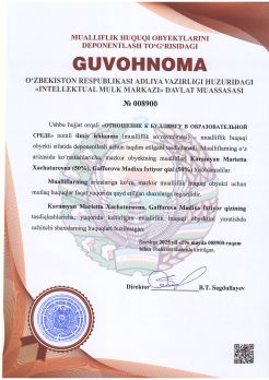 429 | №008894 | Konsepsiya loyihasi – "MAPPING SHOU KONSЕPIYASI VA SSENARIYSI" | Orifjonova Gulra’no Ravshan qizi (50%), Sultonov Oybek Sultonboyevich (50%) | «O‘ZBEKISTON RESPUBLIKASI BOSH PROKURATURASI» | 15.05.2025 | ![]() |