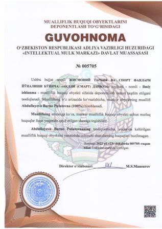 | 4395 | №005705 | Ilmiy ishlanma - ЖИСМОНИЙ ТАРБИЯ ВА СПОРТ ФАНЛАРИ ЙЎНАЛИШИ БЎЙИЧА: "АҚЛЛИ (СМАРТ) ДАРВОЗА" loyihasi | Abdullayeva Barno Pulatovna (100%) | Abdullayeva Barno Pulatovna | 12/23/2022 | ![]() |