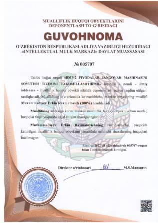 | 4393 | №005707 | Ilmiy ishlanma - "BMP-2 PIYODALAR JANGOVAR MASHINASINI SOVUTISH TIZIMINI TAKOMILLASHTIRISH" loyihasi | Muxammadiyev Erkin Raxmatovich (100%) | Muxammadiyev Erkin Raxmatovich | 12/23/2022 | ![]() |