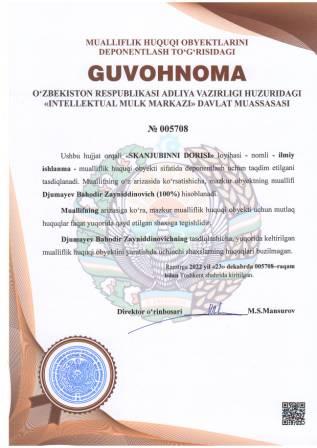 | 4392 | №005708 | Ilmiy ishlanma - "SKANJUBINNI DORISI" loyihasi | Djumayev Bahodir Zayniddinovich (100%) | Djumayev Bahodir Zayniddinovich | 12/23/2022 | ![]() |