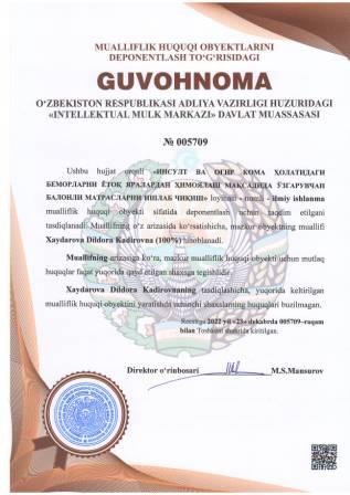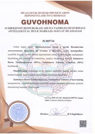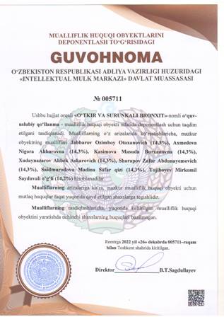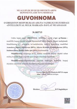 | 4385 | №005715 | O'quv qo'llanma - «BRONXIAL ASTMA» | Axmedova Nigora Akbarovna (80%), Aliyeva Kristina Kamildjanovna (10%), Saidmurodova Madina Safar qizi (10%) | Axmedova Nigora Akbarovna, Aliyeva Kristina Kamildjanovna, Saidmurodova Madina Safar qizi | 12/26/2022 | ![]() |