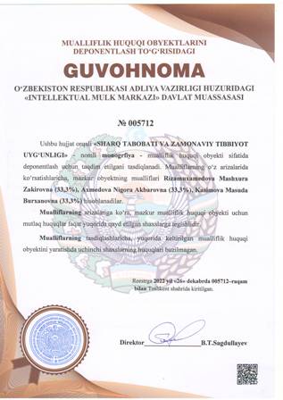 | 4388 | №005712 | Monografiya - «SHARQ TABOBATI VA ZAMONAVIY TIBBIYOT UYG‘UNLIGI» | Rizamuxamedova Mashxura Zakirovna (33,3%), Axmedova Nigora Akbarovna (33,3%), Kasimova Masuda Burxanovna (33,3%) | Rizamuxamedova Mashxura Zakirovna, Axmedova Nigora Akbarovna, Kasimova Masuda Burxanovna | 12/26/2022 | ![]() |