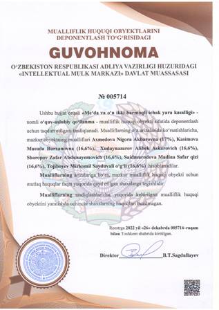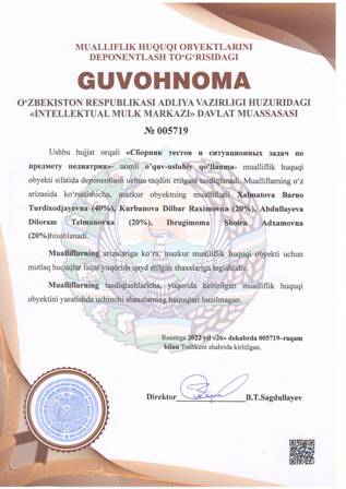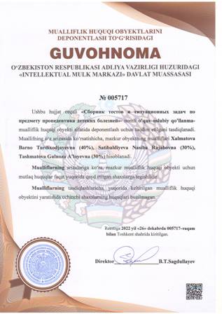 | 4381 | №005719 | O‘quv - uslubiy qo‘llanma - «Сборник тестов и ситуационных задач по предмету педиатрия» | Xalmatova Barno Turdixodjayevna (40%), Kurbanova Dilbar Raximovna (20%), Abdullayeva Diloram Telmanovna (20%), Ibragimoma Shoira Adxamovna (20%) | Xalmatova Barno Turdixodjayevna, Kurbanova Dilbar Raximovna, Abdullayeva Diloram Telmanovna, Ibragimoma Shoira Adxamovna | 12/26/2022 | ![]() |