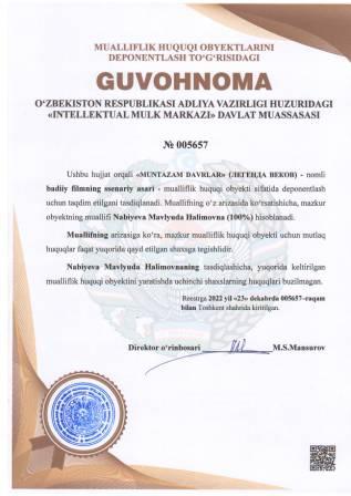 | 4443 | №005657 | Badiiy filmning ssenariy asari - "MUNTAZAM DAVRLAR" (ЛЕГЕНДА ВЕКОВ) | Nabiyeva Mavlyuda Halimovna (100%) | Nabiyeva Mavlyuda Halimovna | 12/23/2022 | ![]() |