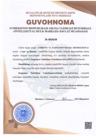 | 4442 | №005658 | O‘quv qo‘llanma - "TIBBIYOT VA FARMATSEVTIKADA METROLOGIYA" | Inagamov Sabitdjan Yakubjanovich (100%) | Inagamov Sabitdjan Yakubjanovich | 12/23/2022 | ![]() |