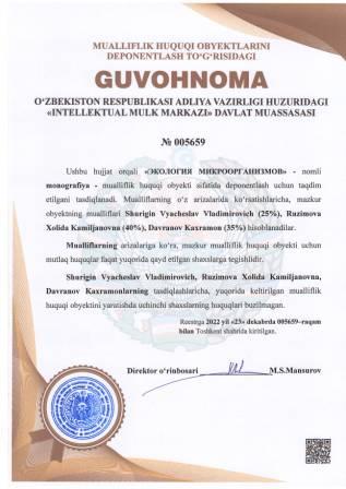 | 4441 | №005659 | Monografiya - "ЭКОЛОГИЯ МИКРООРГАНИЗМОВ" | Shurigin Vyacheslav Vladimirovich (25%), Ruzimova Xolida Kamiljanovna (40%), Davranov Kaxramon (35%) | Shurigin Vyacheslav Vladimirovich, Ruzimova Xolida Kamiljanovna, Davranov Kaxramon | 12/23/2022 | ![]() |