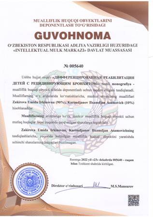 | 4460 | №005640 | Monografiya - «ДИФФЕРЕНЦИРОВАННАЯ РЕАБИЛИТАЦИЯ ДЕТЕЙ С РЕЦИДИВИРУЮЩИМ БРОНХИТОМ» | Zakirova Umida Irkinovna (90%), Karimdjanov Ilxamdjan Asamovich (10%) | Zakirova Umida Irkinovna, Karimdjanov Ilxamdjan Asamovich | 12/23/2022 | ![]() |