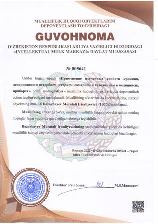 | 4459 | №005641 | Monografiya - «Применение изученных свойств кремния, легированного иттербием, иттрием, самарием и гадолинием в медицинсих приборах» | Bazarbayev Muratali Irisaliyevich (100%) | Bazarbayev Muratali Irisaliyevich | 12/23/2022 | ![]() |