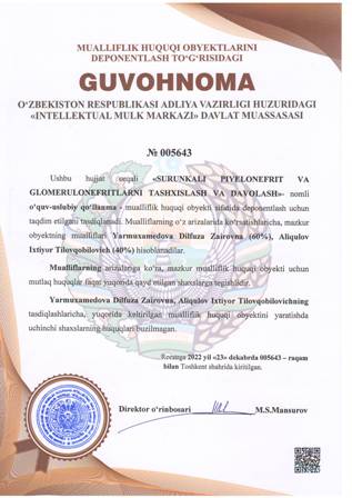 | 4457 | №005643 | O'quv uslubiy qo’llanma - «SURUNKALI PIYELONEFRIT VA GLOMERULONEFRITLARNI TASHXISLASH VA DAVOLASH» | Yarmuxamedova Dilfuza Zairovna (60%), Aliqulov Ixtiyor Tilovqobilovich (40%) | Yarmuxamedova Dilfuza Zairovna, Aliqulov Ixtiyor Tilovqobilovich | 12/23/2022 | ![]() |