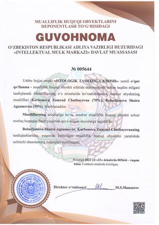 | 4456 | №005644 | O'quv qo'llanma - «SITOLOGIK TASHXISGA KIRISH» | Kurbonova Zumrad Chutbayevna (70%), Babadjanova Shaira Agzamovna (30%) | Kurbonova Zumrad Chutbayevna, Babadjanova Shaira Agzamovna | 12/23/2022 | ![]() |