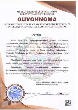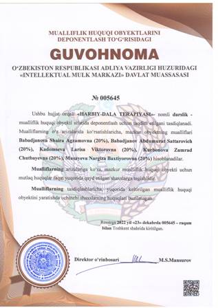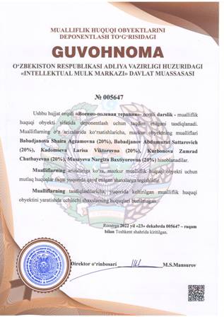 | 4453 | №005647 | Darslik - «Военно-полевая терапия» | Babadjanova Shaira Agzamovna (20%), Babadjanov Abdumurat Sattarovich (20%), Kadomseva Larisa Viktorovna (20%), Kurbonova Zumrad Chutbayevna (20%), Musayeva Nargiza Baxtiyorovna (20%) | Babadjanova Shaira Agzamovna, Babadjanov Abdumurat Sattarovich, Kadomseva Larisa Viktorovna, Kurbonova Zumrad Chutbayevna, Musayeva Nargiza Baxtiyorovna | 12/23/2022 | ![]() |