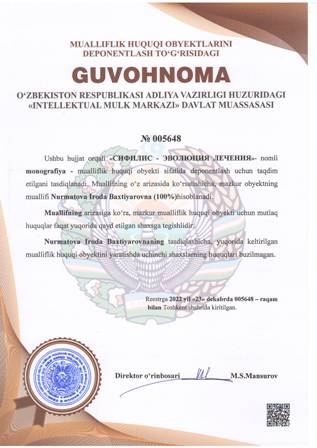| 4452 | №005648 | Monografiya - «СИФИЛИС - ЭВОЛЮЦИЯ ЛЕЧЕНИЯ» | Nurmatova Iroda Baxtiyarovna (100%) | Nurmatova Iroda Baxtiyarovna (100%) | 12/23/2022 | ![]() |
