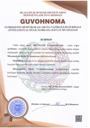 | 4451 | №005649 | O'quv qo'llanma - «REVMATIK KASALLIKLAR» | Miraxmedova Xilola To‘xtasinovna (100%) | Miraxmedova Xilola To‘xtasinovna | 12/23/2022 | ![]() |