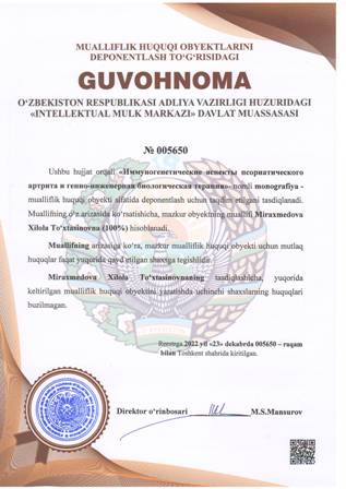 | 4450 | №005650 | Monografiya - «Иммуногенетические аспекты псориатического артрита и генно-инженерная биологическая терапия» | Miraxmedova Xilola To‘xtasinovna (100%) | Miraxmedova Xilola To‘xtasinovna | 12/23/2022 | ![]() |