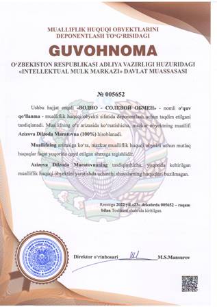 | 4448 | №005652 | O'quv qo'llanma - «ВОДНО - СОЛЕВОЙ ОБМЕН» | Azizova Dilzoda Maratovna (100%) | Azizova Dilzoda Maratovna | 12/23/2022 | ![]() |