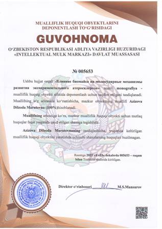 | 4447 | №005653 | Monografiya - «Влияние биомайса на молекулярные механизмы развития экспериментального атеросклероза» | Azizova Dilzoda Maratovna (100%) | Azizova Dilzoda Maratovna | 12/23/2022 | ![]() |