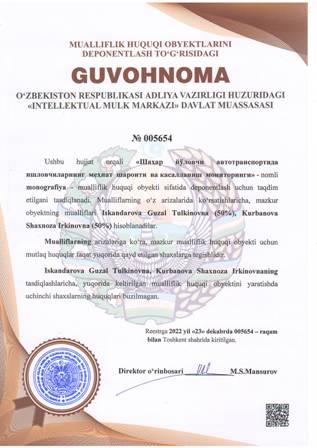 | 4446 | №005654 | Monografiya - «Шаҳар йўловчи автотранспортида ишловчиларнинг меҳнат шароити ва касалланиш мониторинги» | Iskandarova Guzal Tulkinovna (50%), Kurbanova Shaxnoza Irkinovna (50%) | Iskandarova Guzal Tulkinovna, Kurbanova Shaxnoza Irkinovna | 12/23/2022 | ![]() |
